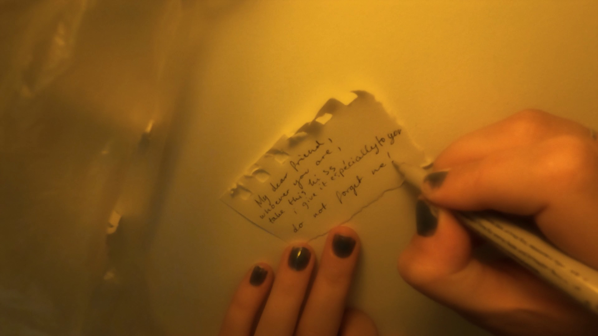 Video (Full HD) 9'46" An assemblage of different imagery, sounds, and poems. In this fragmentary form, as that of memories, there is a melancholy of aftermath and an impression that the end already happened. A paper note is left in a hole; to be found or not.